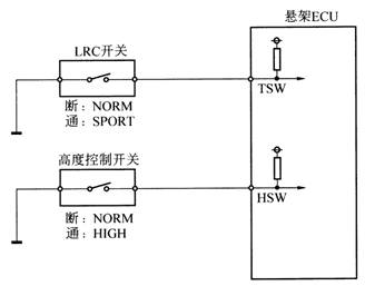 LRC开关和高度控制开关与悬架ECU的联系如图所示。当LRC开关和高度控制开关设在“NORM”位置时,12V的电压分别加在悬架ECU的TSW端子和HSW端子;当LRC开关设在“SPORT”位置、高度控制开关设在“HIGH”位置时,悬架ECU的TSW端子和HSW端子的电压变为0V。悬架ECU据此判断设置模式。当LRC开关设在“SPORT”位置时,组合仪表内的LRC指示灯亮;当高度控制开关设在“HIGH”位置时,组合仪表内的另一高度控制指示灯也亮。