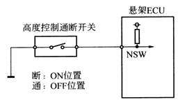 高度控制通断开关与悬架ECU的联系如图。当开关拨至OFF位置时,悬架ECU的NSW端子接地,电压为0V,ECU中止车辆高度控制。