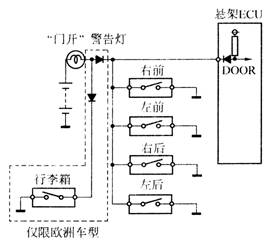 4个车门各有一个门控灯开关,这些开关都位于门柱上,如图所示。当所有的门都关上时,所有开关都断开,蓄电池电压加在悬架ECU的DOOR端子上;当有任一个门打开时,悬架ECU的DOOR端子电压变为0V,如图所示(ucFl0车型)。悬架ECU据此判断车门是打开还是关上。