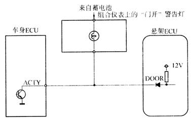 对于ucF20车型,由于采用了多路传输通信系统,各车门的门控灯开关并非直接与悬架ECU相连,而是通过各车门的ECU和车身ECU,最终由车身ECU与悬架ECU发生关系,如图所示。而结果则与ucF10车型相同,