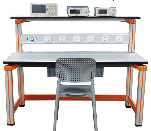 实训桌规格为1200(长)*700(宽)*1300(高),设有一个抽屉;实验桌主体结构全部采用高性能表面氧化的铝型材及一次成型铝压铸框架连接构件,连接构件采用压铸成型工艺(非焊接工艺),经机加工、抛丸、喷砂,表面静电喷涂工艺,安装方便、快捷,用户可自行DIY组装。桌体立柱采用工业铝型材成型工艺,表面氧化处理,截面尺寸:70mm×70mm,四面带槽,槽宽约8mm,端部装有注塑成型配套塑料堵头。桌面采用25mmE1级三聚氰胺饰面板,桌面板下设支撑框架,承受力不少于300kg。配备储存柜,存放元件及工具,储存柜底部4只高强度万向可制动PU脚轮,方便移动。实训装置整体简约不简单,高端大气,符合现代化产品审美和发展趋势。