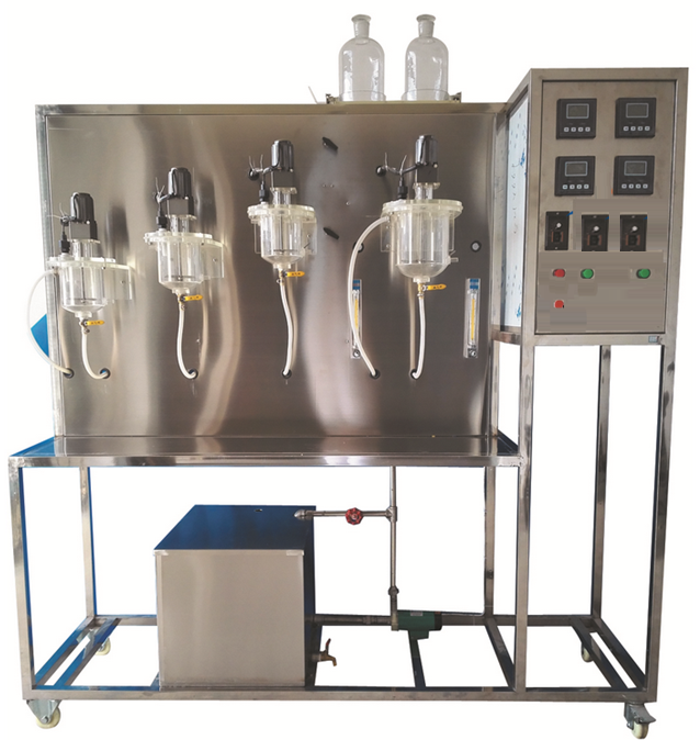 1、釜式反应器1.0L,直径φ120mm,高度120mm,有机玻璃制成,3个。 2、釜式反应器3.0L 直径φ150mm,高度200mm,有机玻璃制成,1个。 3、MP-20RM微型磁力泵:功率30W,最大流量1m3/h,扬程6m。 4、交流可调速电机:搅拌马达6W,转数90-600r/min,无级变速调节。其操作板置于控制柜上,转速可在操作板上进行调节。 5、LZB-10液体转子流量计:流量范围6~60 L/h ,观察、控制进水流量。 6、数显电导率仪:在线电导率检测仪,0-2000S·cm 4个,电导电极:4支。 7、LWB电磁阀(24v)和三通阀控制切换示踪剂,数显计测器控制示踪剂加入量。 8、各项操作及转速、电导率、流量的显示、调节、控制全在控制屏面板进行。 9、框架为304不锈钢材质,结构紧凑,外形美观,流程简单、操作方便。 10、外形尺寸:1800×500×2000mm(长×宽×高),外形为可移动式设计,带3寸双刹车轮。 11、转换模块及在线监控软件一套。 |