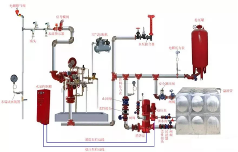 6、预作用系统在准工作状态时配水管道内不充水,由火灾自动报警器自动开启预作用阀后,转换为湿式系统,预作用系统由闭式喷头、预作用阀组、充气设备(不是必须有)、水流报警装置、供水设施及供水配水管道等消防器材组成。