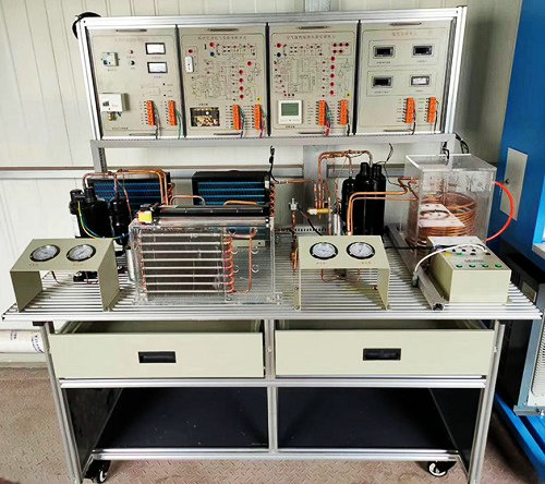 热泵与制冷系统技能实训操作台包含了制冷、热力学、传热学和电气控制等技术,主要由热泵型家用空调系统和空气源热泵系统两大部分组成。在铝合金导轨式实训台上安装冷凝器、蒸发器、节流装置、压缩机、控制电路等,构成一个典型的制冷装置,电气控制采用挂箱式,能进行制冷系统的组装、调试、运行,真实呈现制冷装置的工作过程,通过对制冷系统的安装、保压、检漏、抽真空、电气连线、加氟、系统调试及工况调整等,完成对学生的现代制冷与空调系统设备安装、调试和维修技能训练。
