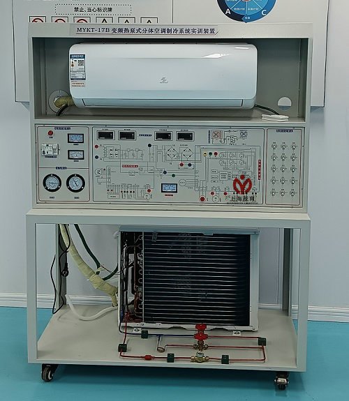 3、实训装置直观展示了热泵型分体空调的系统结构、工作原理,可清楚的看到制冷循环系统结构及主要部件的实物,系统还配置有交流电压表、交流电流表、温度表、真空压力表、信号灯及发光二极管使整个分体空调系统的实时工作状态一目了然;主面板左边设有一块有机玻璃板,透过它可看到空调器主控板的器件及布局;主面板中间印有控制系统原理图,并设有相应测试点;便于教学演示讲解及学生对课本知识的理解掌握。此外,管路中设有视液镜可观察制冷剂状态;高压管路为红色部分,低压管路为蓝色部分。相应部件均有名称标识