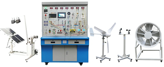 风光互补发电测量与控制实验平台主要由风力发电机组、太阳能光伏电池组、控制器、蓄电池、逆变器、交流直流负载、开关控制模块、环境监测模块、仪表显示等部分组成,通过PLC控制、触摸屏和变频器作为控制核心,带有A/D、D/A模块、模拟量输入/输出模块、交流电机变频调速系统。系统于风能发电、光伏发电为一体的教学实训系统;各系统通过连接电缆进行连接,形成一套可完成风力及光伏发电、同步并网、离网电源的实验及教学演示。帮助学生理解太阳能并网、离网及风力发电系统的原理,从而起到学习工程实际应用技能的作用。