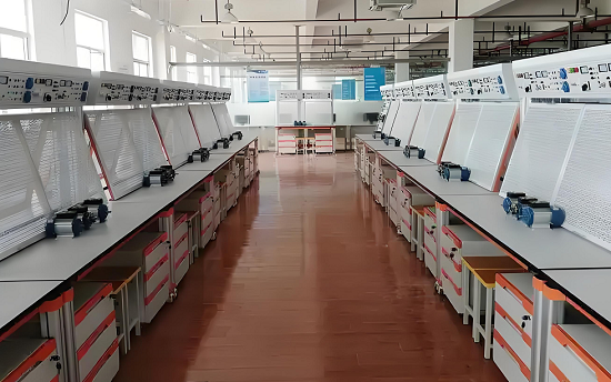 2、实训桌桌面采用25mm麻灰色高密度层压板封边特制,有效提高绝缘等级;实验桌底部装有至少4个导向轮,方便实训台架移动;