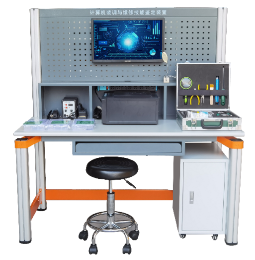 4、操作台底部按照工具挂板结构设计,配置显示器固定装置,能够调整显示器高度和倾角,方便学生实训操作。也可以方便挂装各种实操工具和实训导线。