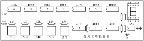 4个D触发器的D端作为抢答操作状态输入,设A组先按按钮,A组的D=1,在CP作用下,QA=1, =0。由于 =0,使门G1输出为1,G2门输出为0,封锁了CP,使其他后按的D状态传不到Q端。当A输出为1时,其他输出为0,通过译码电路,使数码管显示“A”字符。字符显示译码器的译码表如下。| QA QB QC QD | a b c d e f g |