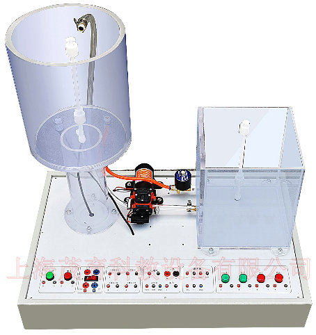 水泵由一功率放大电路来驱动,储水箱中的水从有机玻璃水箱顶部进入,底部用一手动阀门控制出水的流量。用扩散硅压力变送器来检测液位,输出4~20mA标准信号,通过PLC可编程控制器可实现液位的开关和闭环控制,它可作为学校老师和科研技术人员作为研究PLC算法控制的一个实验平台。