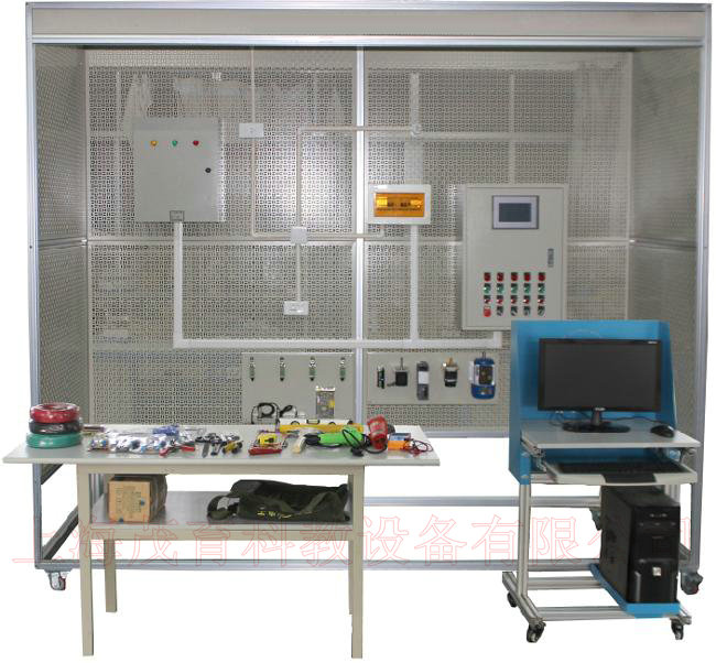 7)该设备主要由模拟房、实训柜、装配桌、电脑桌、模块架、伺服电机模块、步进电机模块、双速电机模块、交流异步电机模块、传感器模块、电源电源箱模块、电气控制箱模块、工具配件组成。