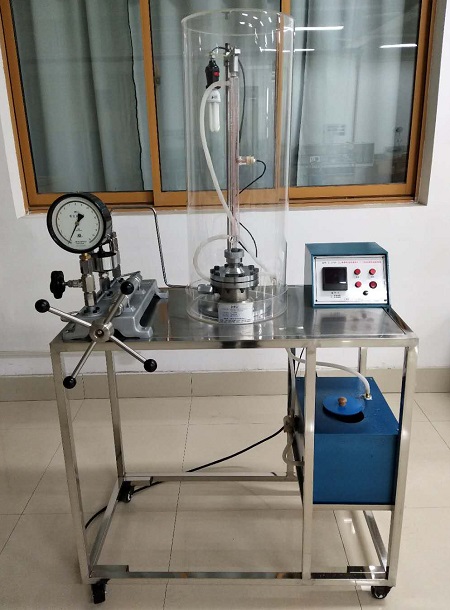 实验中,由压力台送来的压力由压力油进入高压容器和玻璃杯上半部,迫使水银进入预先装了CO2气体的承压玻璃管,CO2被压缩,其压力和容器通过压力台上的活塞杆的进、退来调节。温度由恒温器供给的水套里的水温来调节。