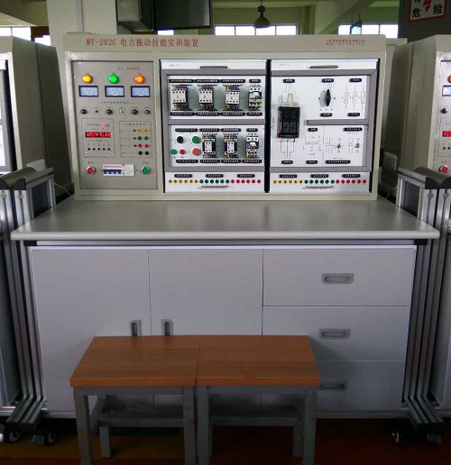 电力拖动技能实验装置-(MY-202C)是根据职业教育和就业人员实际操作、培训、鉴定的需求,我公司综合了大中专院校、职业院校、技工学校的《电力控制技术》《电力拖动控制线路与技能训练》《工厂电气控制技术》《继电接触控制技术》《PLC原理及应用技术》等相关科目的实验及实训教学内容而研发了本装置。装置采用挂箱结构,实训项目可扩展性强,可扩展电工技能或与变频调速实训项目。所有的元器件通过导线引到接线端子上,有利于保护器件,通过线槽走线,接近工业现场。是各大中专院校、培训机构理想的实训考核设备。