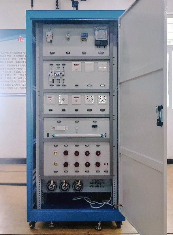 该设备按照标准电气控制柜设计制造(规格:800×460×1850mm),利用双面空间位置,柜内装有完成各种照明电路所需的单相电度表、日光灯、白炽灯、单联开关、感应开关、声控开关、触摸开关、插座等,以及电气控制所需要的多种低压电器,如漏电断路器、熔断器、电流互感器、接触器、中间继电器、时间继电器、热继电器、行程开关、按钮、信号灯、转换开关、电压表、电流表以及三相四线有功电度表等。为了延长电器的使用寿命,降低材料消耗,各电器的接点都已与接线端子相连,学生只需在接线端子上接线训练,以求电气元件经久耐用。技训柜还配备多台附属电机,通过该电动机支持可作各种实验。