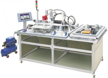 本装置的实训工作台为铝合金型材组合而成,台面上安装有上料、传送、冲压加工、夹紧、 钻孔加工、分拣、入料槽等,并配有液压系统、气压系统、变频器及继电器控制、PLC等