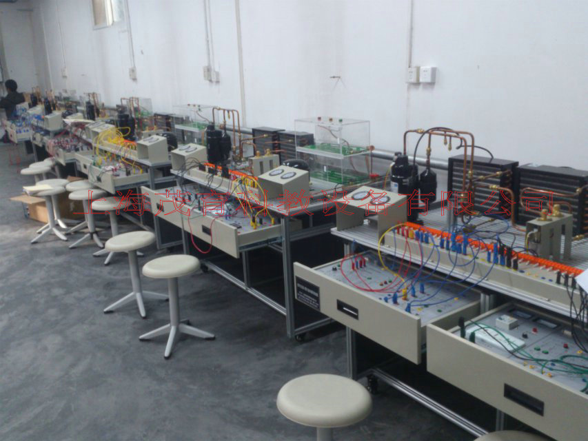 2、导轨式铝合金安装平台由标准规格的铝合金工业型材组成,作为学生操作训练的平台,上面安装有空调系统部件和冰箱系统部件。