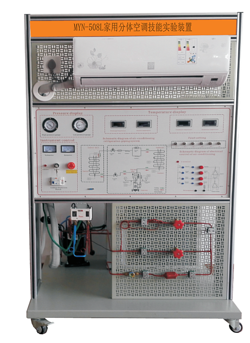 壁挂式空调技能实训考核装置--采用真实空调为实训对象,可使学员能够真正地学到相应的技术技能,装置由金属支架、制冷系统、制冷系统流程板和智能排故系统四部分组成,在制冷系统流程板上配置相应的压力及温度表,可以直接观测到制冷系统的各点工作时的参数,通过分析参数,可以了解制冷系统的工作状态,提高学生对制冷系统的分析判断能力。