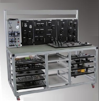 本装置由通用工作台及面板支架、由工业铝型材组成的使用T型槽螺母进行安装的安装件以及各实训模块组成,各实训模块不用时可存放到通用工作台中,使用时取出进行装配调整,使用方便,配置灵活,能满足不同阶段学生教学实训任务的需要。