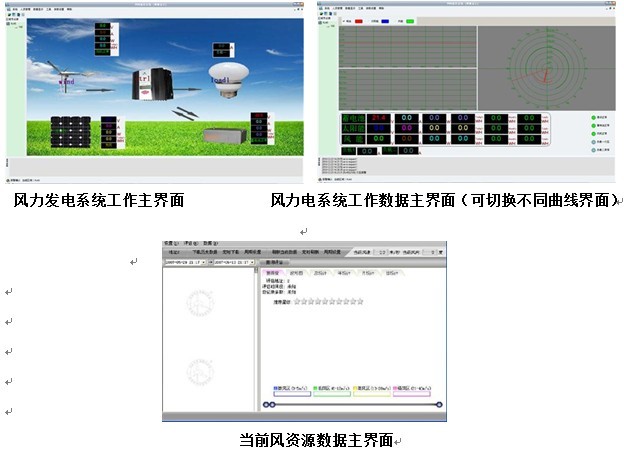 ◆ 显示内容:蓄电池电压、风机电压、光伏电压、风机电流、光伏电流、风机功率、光伏功率,能量模拟图,当前风速(米/秒),当前风向(度),当前风力资源平估。