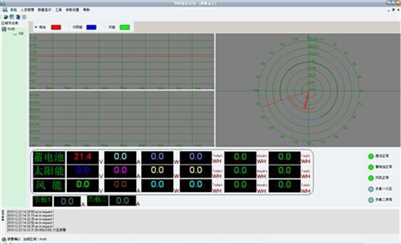 2、显示内容:蓄电池电压、风机电压、光伏电压、风机电流、光伏电流、风机功率、光伏功率,能量模拟图,当前风速(米/秒),当前风向(度),当前风力资源平估。