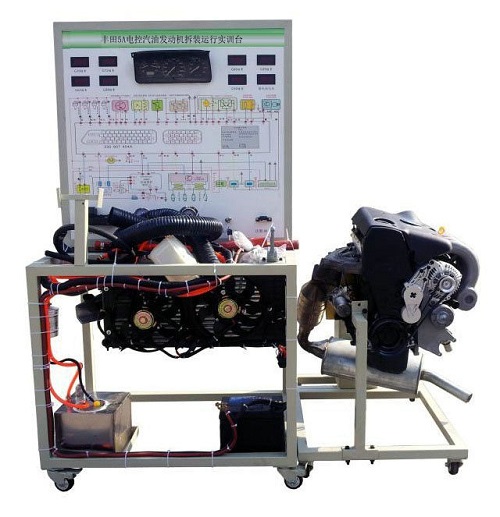 拆装翻转台架由电控汽油发动机总成和可做360度翻转的发动机拆装架组成,运行检测控制台由控制面板、发动机电控单元、冷却系统、供油系统、蓄电池等组成;
