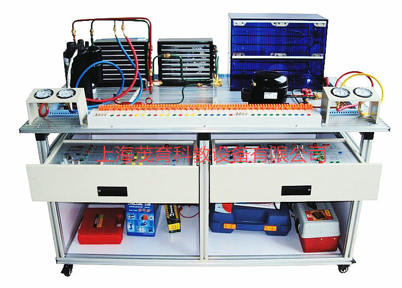 2、导轨式铝合金安装平台由标准规格的铝合金工业型材组成,作为学生操作训练的平台,上面安装有空调系统部件和冰箱系统部件。