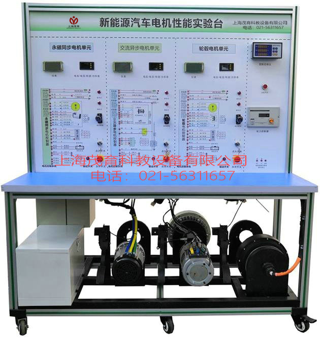 电动汽车电机性能试验台,电动汽车电机性能实验装置,电动汽车电机性能实验设备由实训台架、新能源汽车电池组、三种新能源汽车常用电机(永磁同步、交流异步、轮毂电机)、三种新能源汽车配套电机控制器、加速踏板、档位器、数显电压电流表、转速表、扭矩表、功率表、工控机(需要另外配)等模块组成。