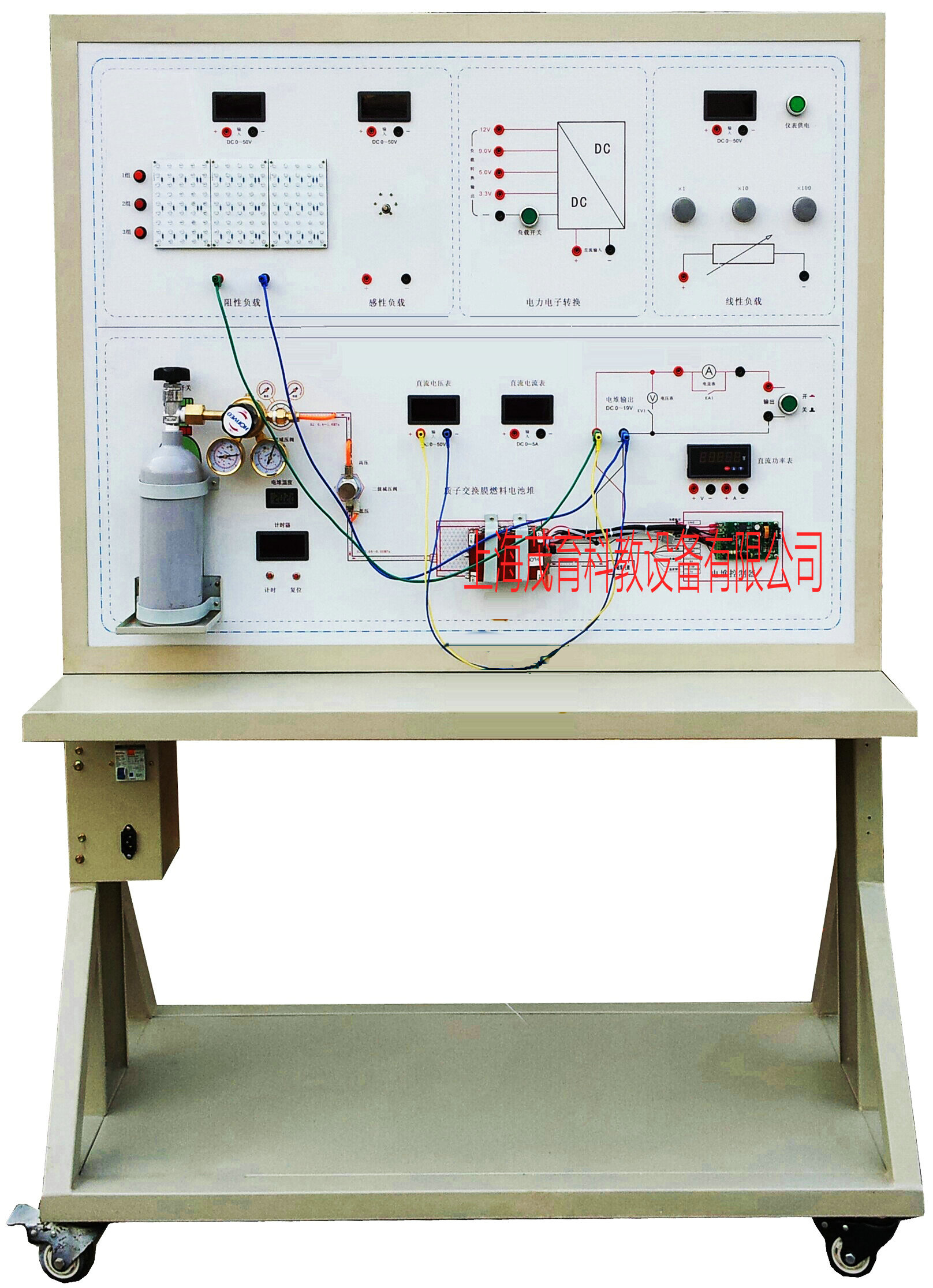 示教板采用点火开关、燃料电池(氢气)、直流电动机、发光二极管组件、制动开关等。12V开关电源、大型彩色喷绘电路原理图、控制面板、可移动台架、使用说明书及实训指导书等。