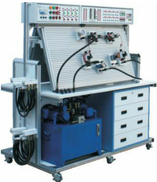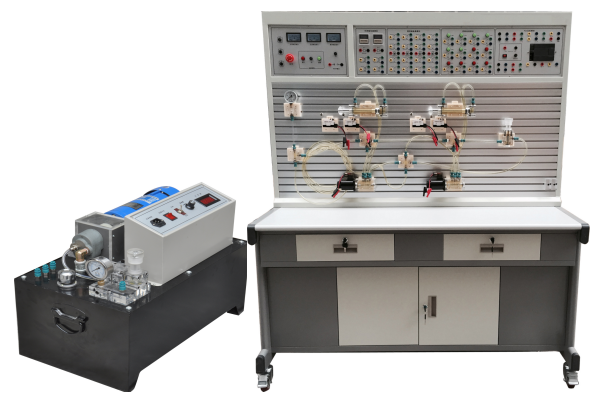 实验台由实验台架、工作泵站、气动元件、电气控制单元等几部分组成。